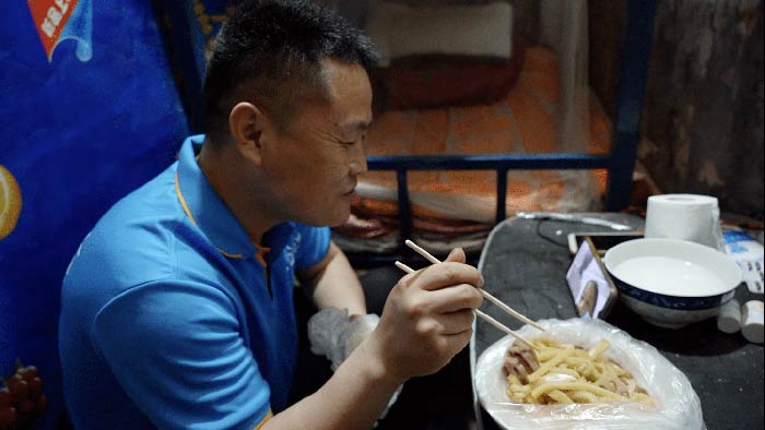 跑单的间隙,利用吃饭的时间,打开手机,和远在山东菏泽的妻儿视频聊天,是丰全明一天中最轻松、最快乐的时光。41岁的他,是两个孩子的父亲。