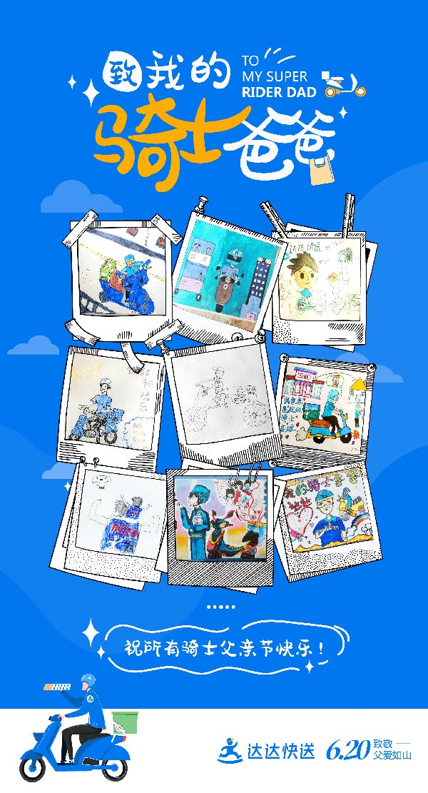 父亲节来临前,达达快送发起关爱骑士子女活动,向平台几十万骑士发出感谢信,并向骑士子女征集“我心中的骑士英雄”画作。孩子们投稿踊跃,平台共收集到200余份画作,并从中筛选出20多份优秀画作。他们将获得千元家庭体检卡、心愿礼金和文具礼包。